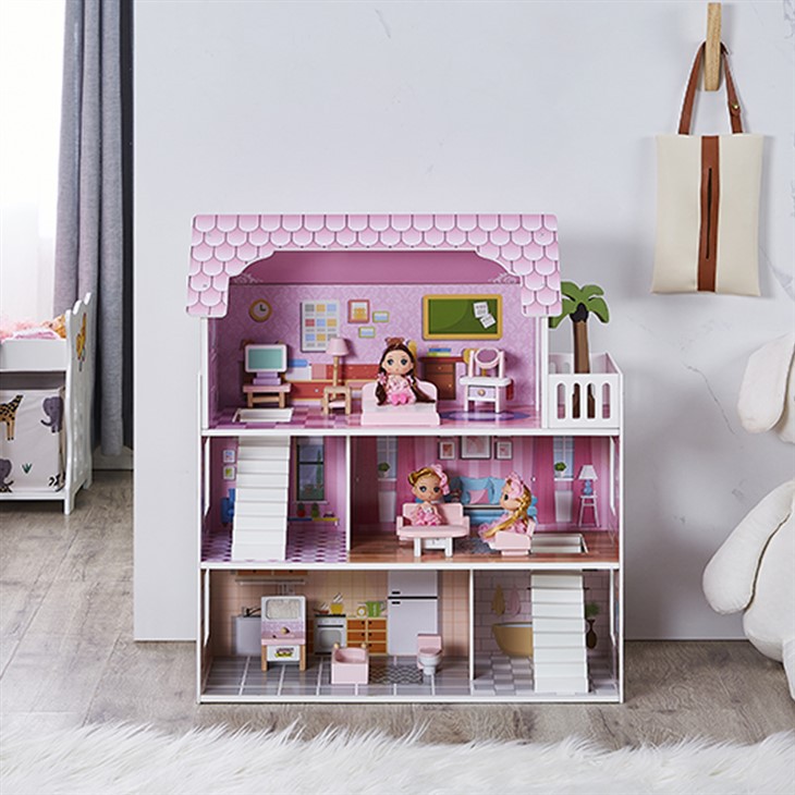 Questa casa delle bambole in legno con adesivi rosa è solitamente composta da più stanze, tra cui camere da letto, soggiorni, cucine, bagni e così via.